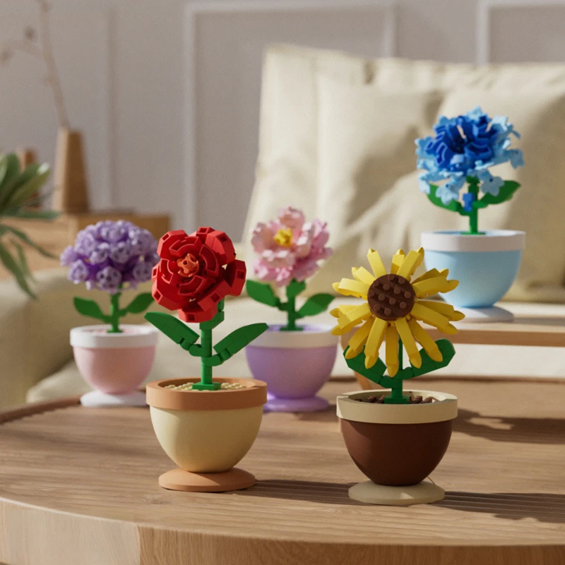 Building Blocks, Flower Pots, Roses, Sunflowers, Carnations, Micro-Grained Children'S Educational Assembly Toy Ornaments